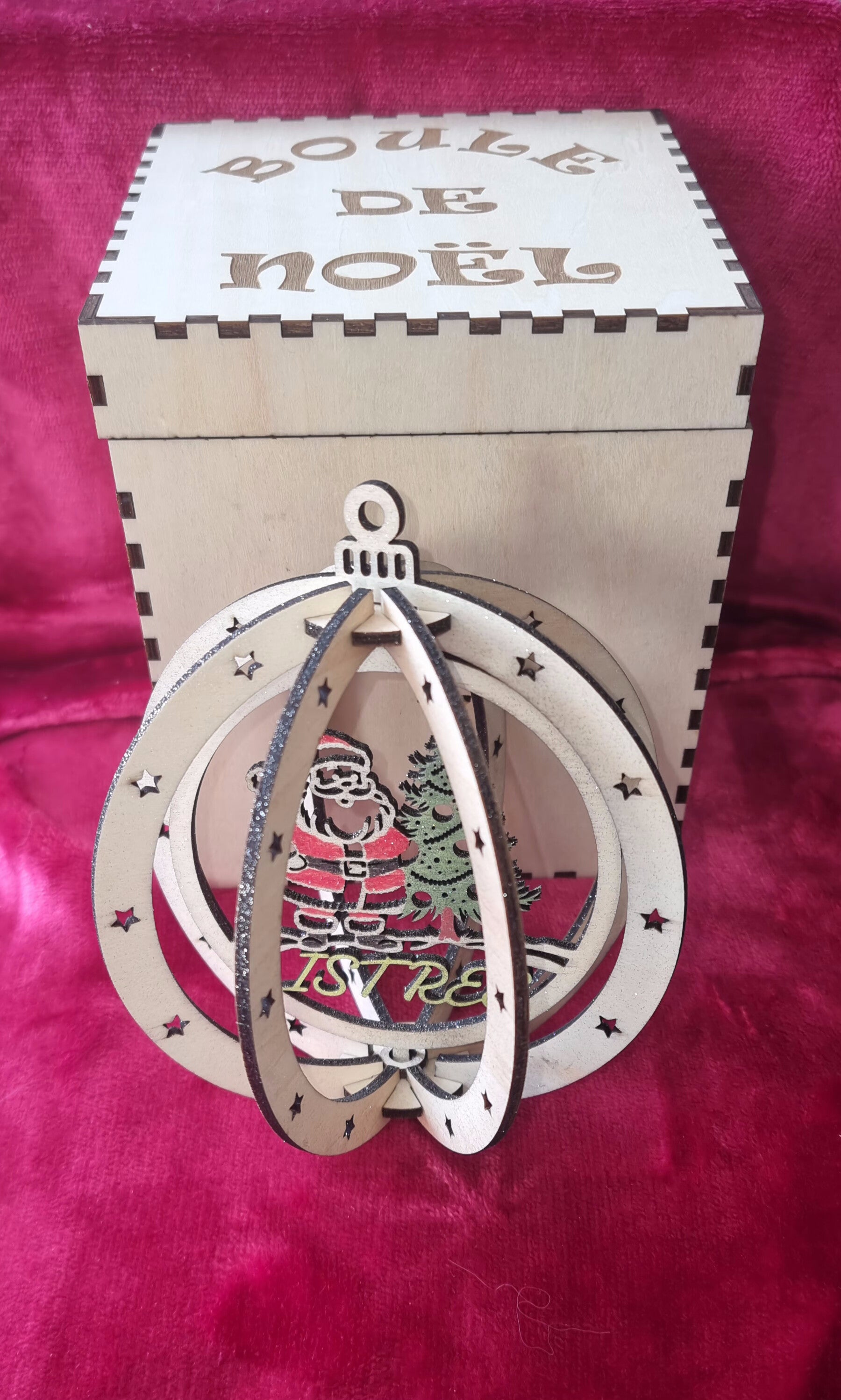 Boule de noël en bois gravé et découper au laser centre de la boule mobile simple ou aussi personnalisable.